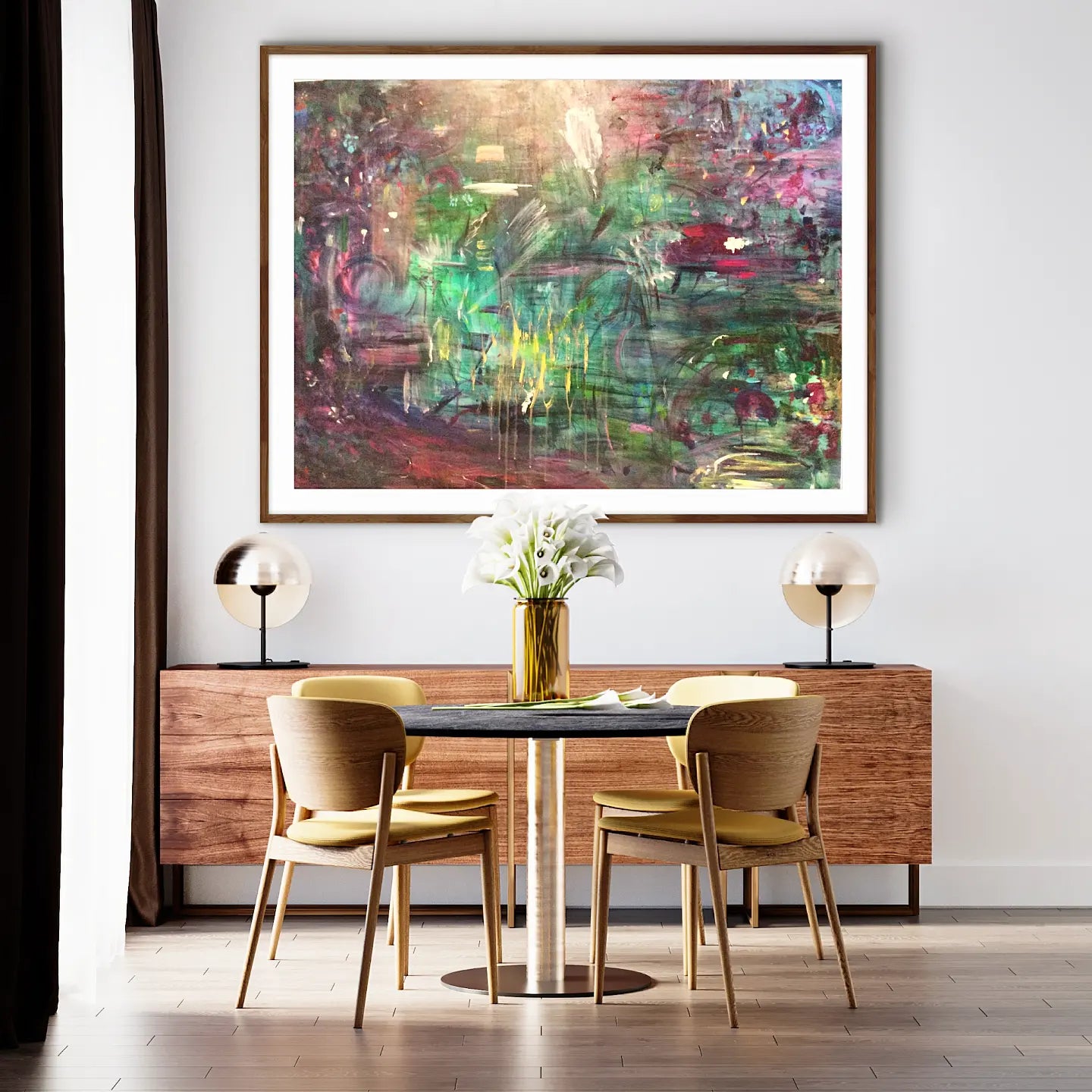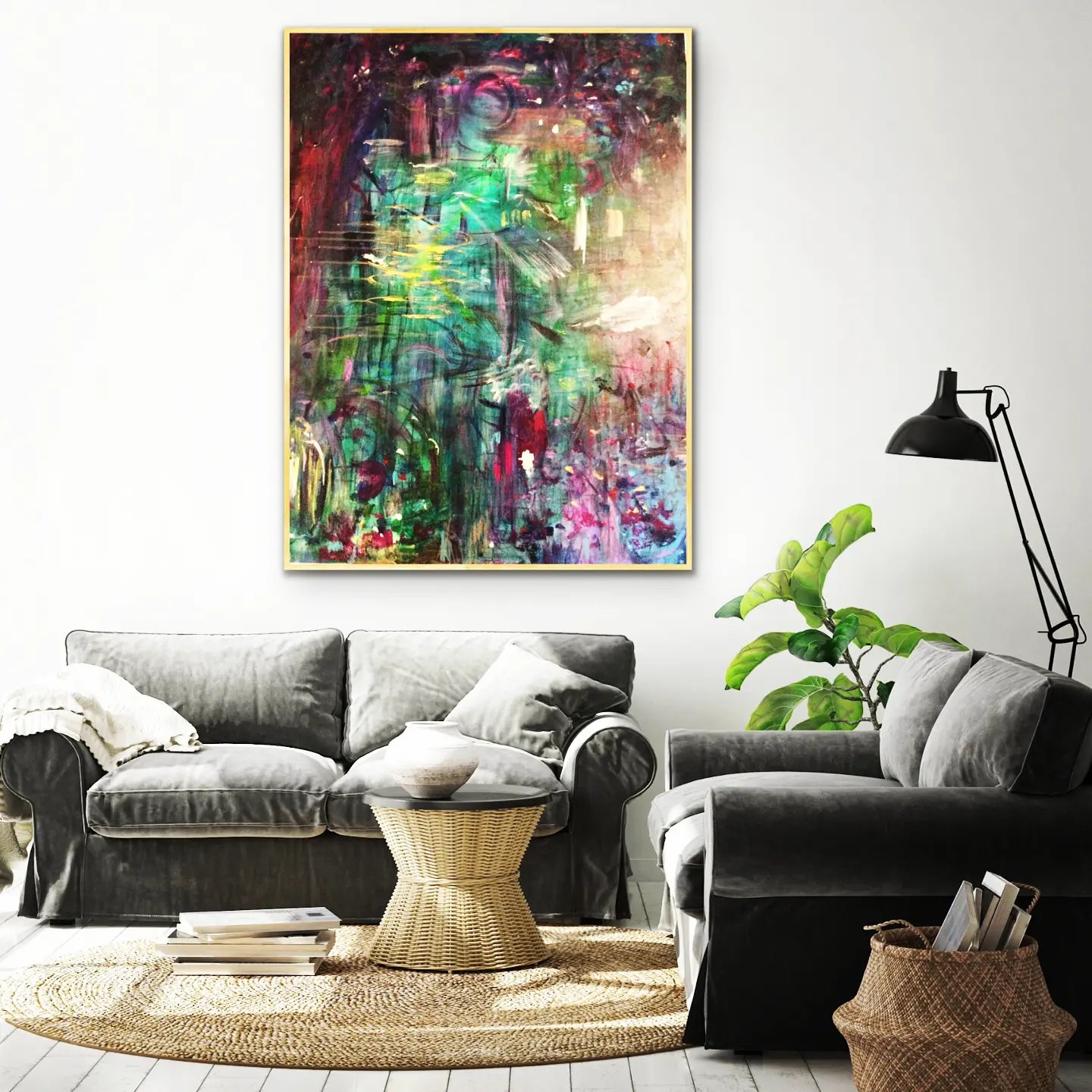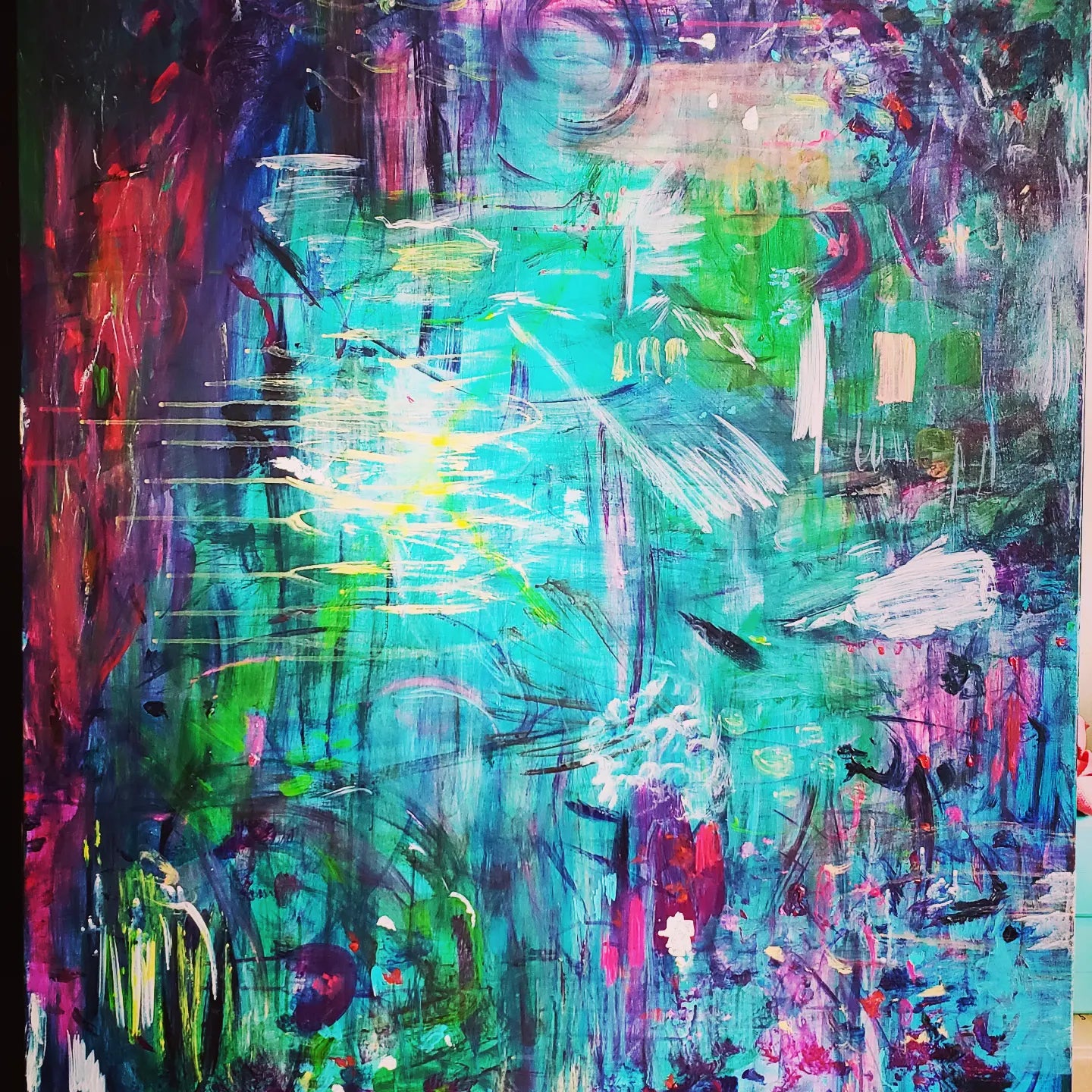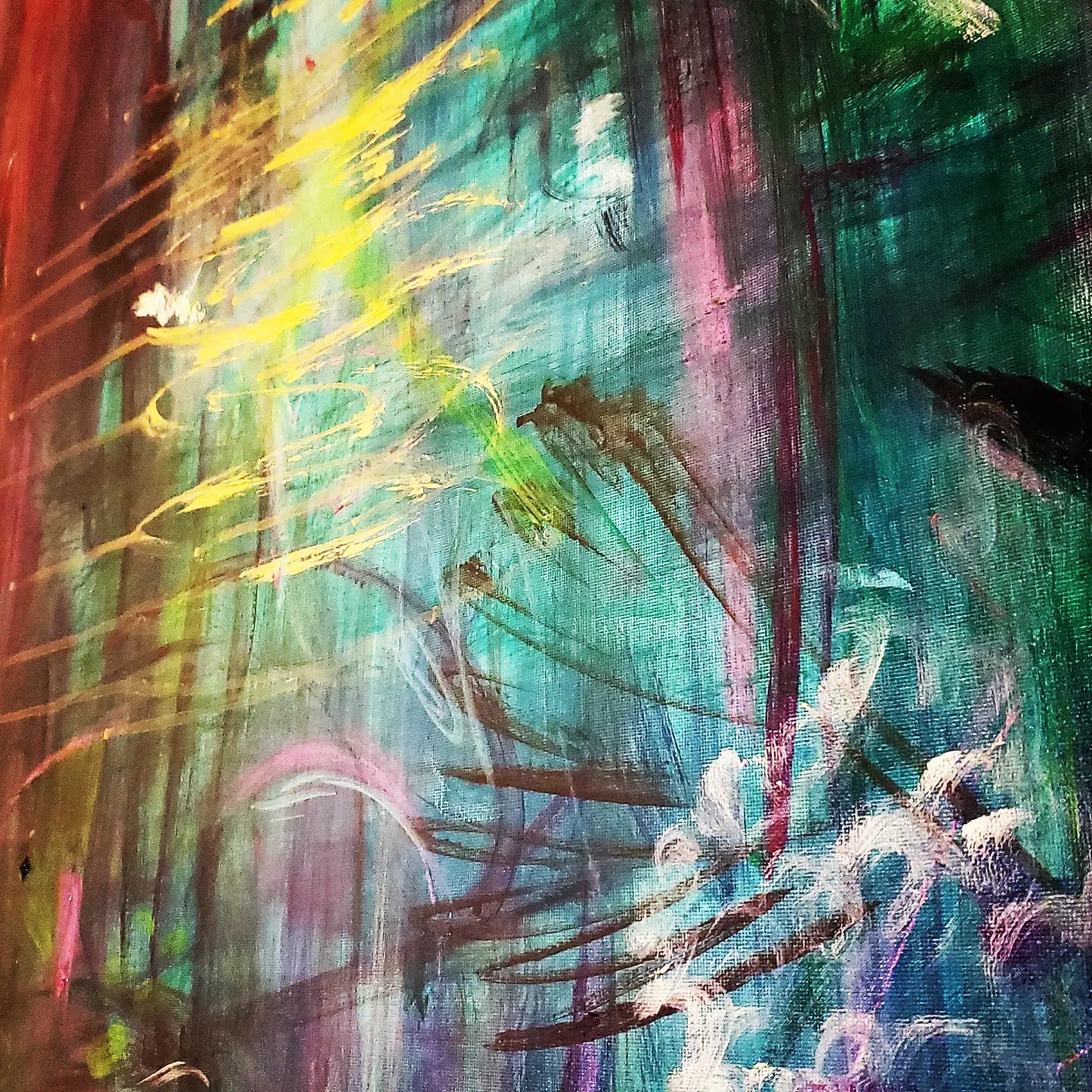 Bright abstract expressionism landscape on 36x48 inch gallery wrapped canvas.