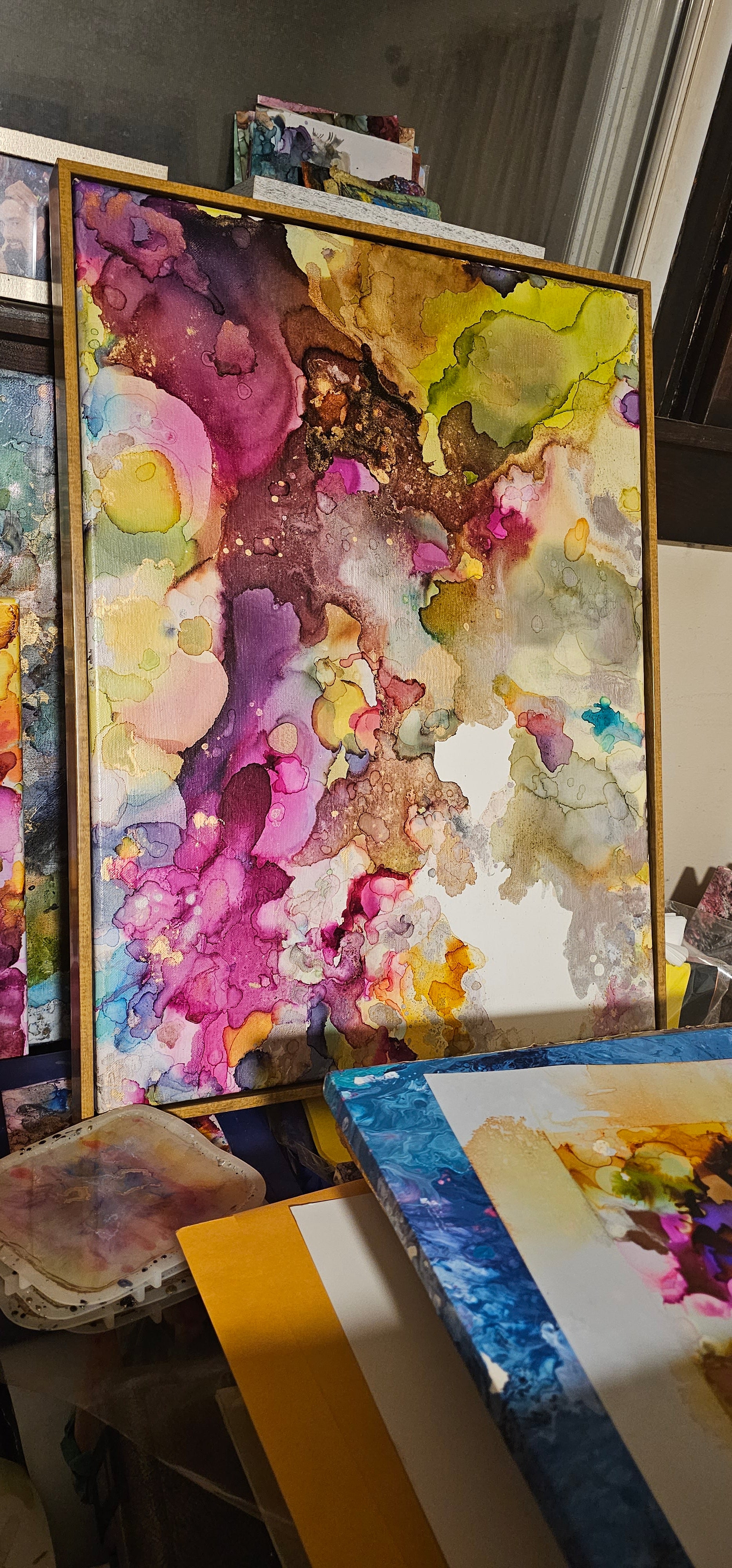 Original art. Colorful abstract expressionism pour painting piece created with alcohol inks on 18 x 24 inch gallery wrapped canvas. Framed in natural wood.